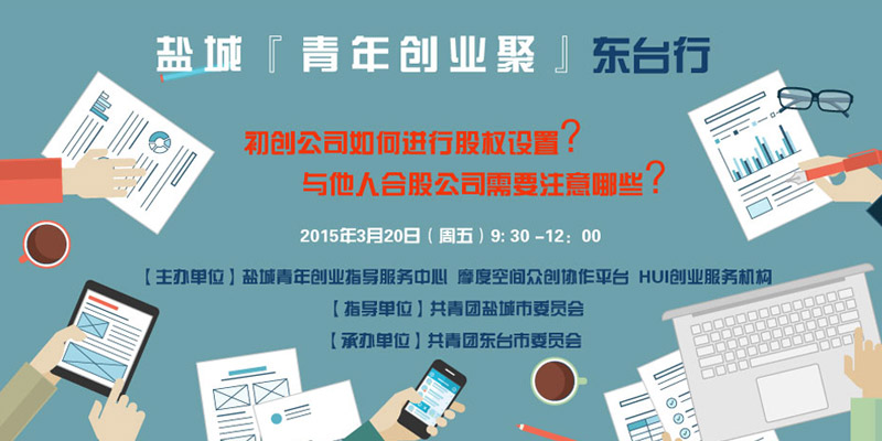 2015年3月20日,“青年创业聚”在东台将举办创业沙龙活动,为创业者提供更新更专业更有 力量的帮助,活动主题:初创公司如何进行股权设置,与他人合股公司应该注意哪些?