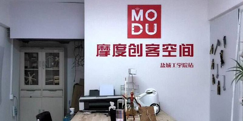 摩度众创空间校园站第一站——盐城工学院站创客空间环境一角。摩度众创空间为校园 站创客空间给予技术支持、项目管理、创业指导等一系列全方位的服务。摩度空间持续 助力大学生创业、孵化项目,创新合作模式,以品牌共建的方式帮助大学生将创意转化 为现实。 欢迎其它高校积极参与到摩度众创空间校园站行动!
