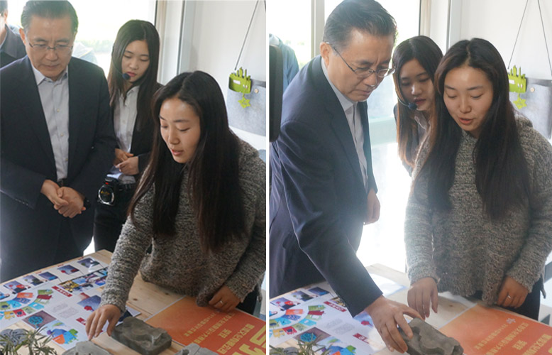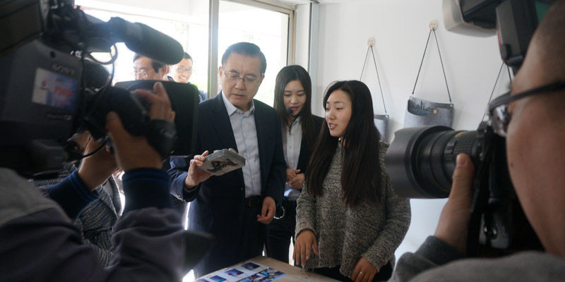 朱克江书记认真听完摩度众创空间校园站学生负责人介绍,对校园“创客”大学生设计的 关于江苏地域特色的作品很是感兴趣。询问了望乡花盆用的材料和寓意,对地区城市轮 廓的这个创意表示认可,还表示口袋城市的包包很有创意。